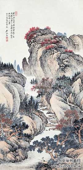 吴琴木(1894—1953),名桐,号琴木,冷枫居士,浙江震泽人。后定居江苏常熟,以卖画为生。师从樊少云,擅山水画,画风近“四王”而趋于甜柔。 吴琴木山水境界宏阔,场面巨大,往往一图能展现百里气势,勾建出理想中的人文情怀。自古华山一条道,华山以险峻著称于世,此图以林文忠游华山诗意为题,谱写了一篇壮丽的华山乐章。高崖之上有两人正抬手眺望,欣赏着华山美景,重山巨嶂,起伏跌宕,峰峦耸翠,逶迤崚嶒;云蒸霞蔚,飘浮无常;苍松翠柏,古木杂松,纵横交错,掩映多姿。此图采用散点透视,把景物分成多个视点、多角度、多层面,并有机地结合在一起,既拉开了画面的层次空间感,不显雷同,又丰富和开阔了画面。全画用笔精细周到,敷色雅致,突出了华山奇险雄峻,壮丽多姿的形态。 |